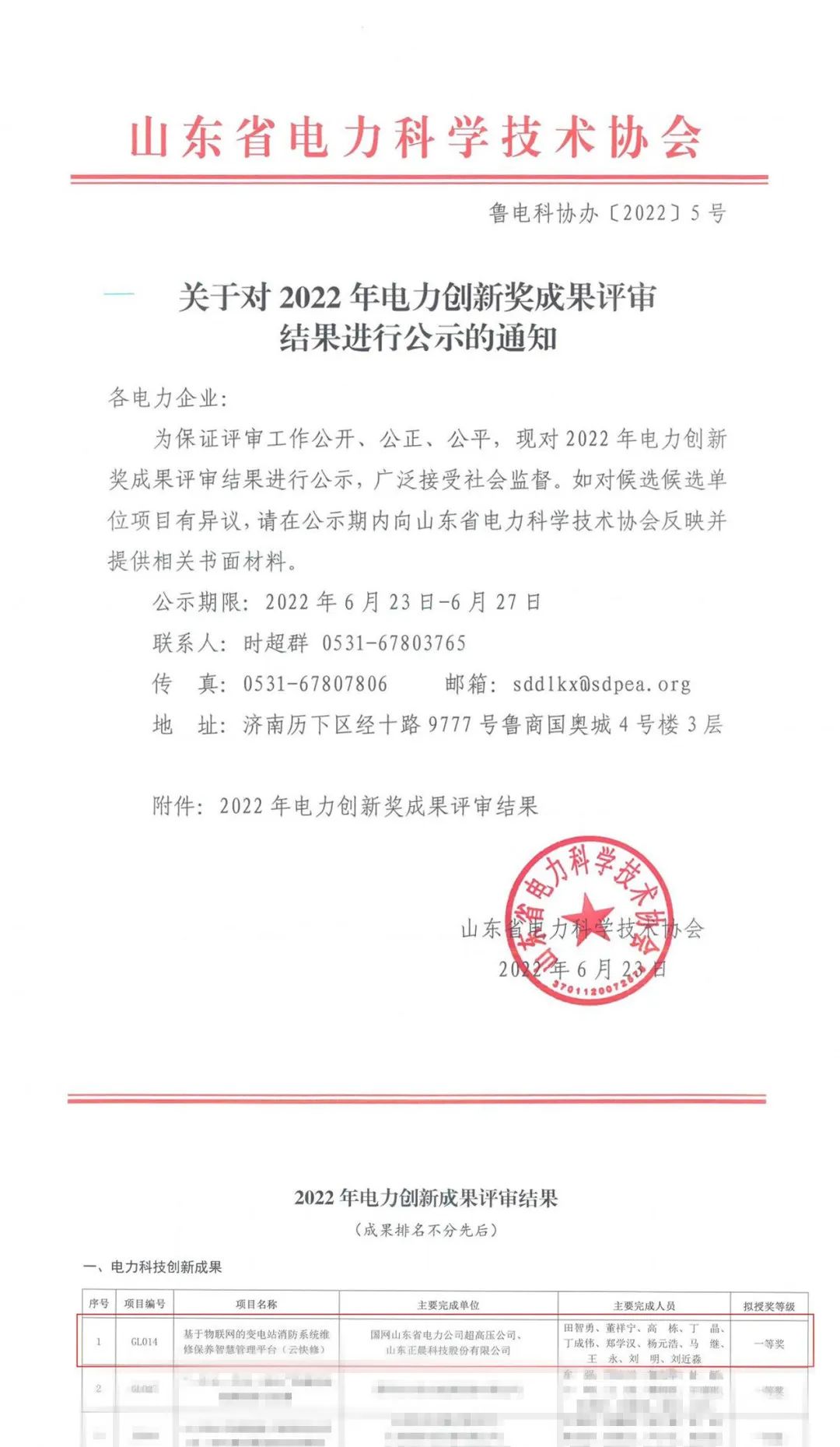 近日,新利网页版与国网山东省电力公司超高压公司联合研发的《基于物联网的变电站消防系统维修保养智慧管理平台(云快修)》通过了山东省电力科学技术协会评审,荣获2022年电力科技创新成果一等奖,并获推荐申报中国电力企业联合会2022年度电力创新奖。